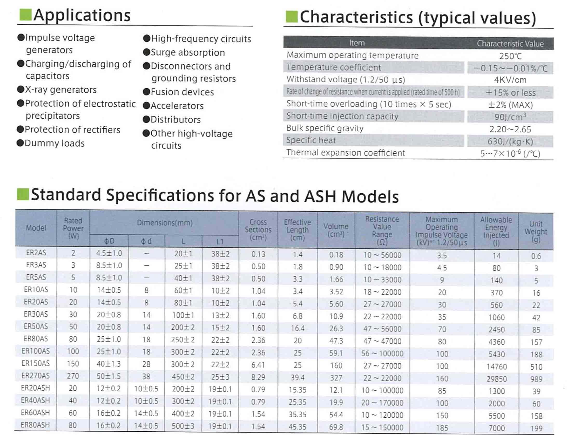 AS.ASH電阻器 熱容量大,產品組成強韌適用於衝擊電壓,且耐久性佳。也適用於高壓電迴路中。 |